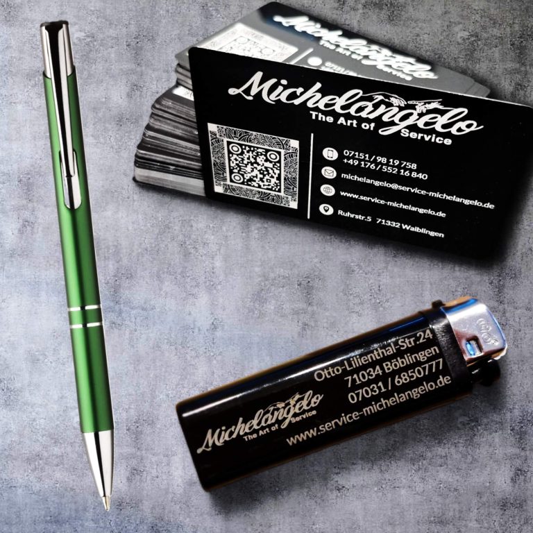 Kugelschreiber und Metall-Visitenkarten für einen starken, professionellen Markenauftritt.
